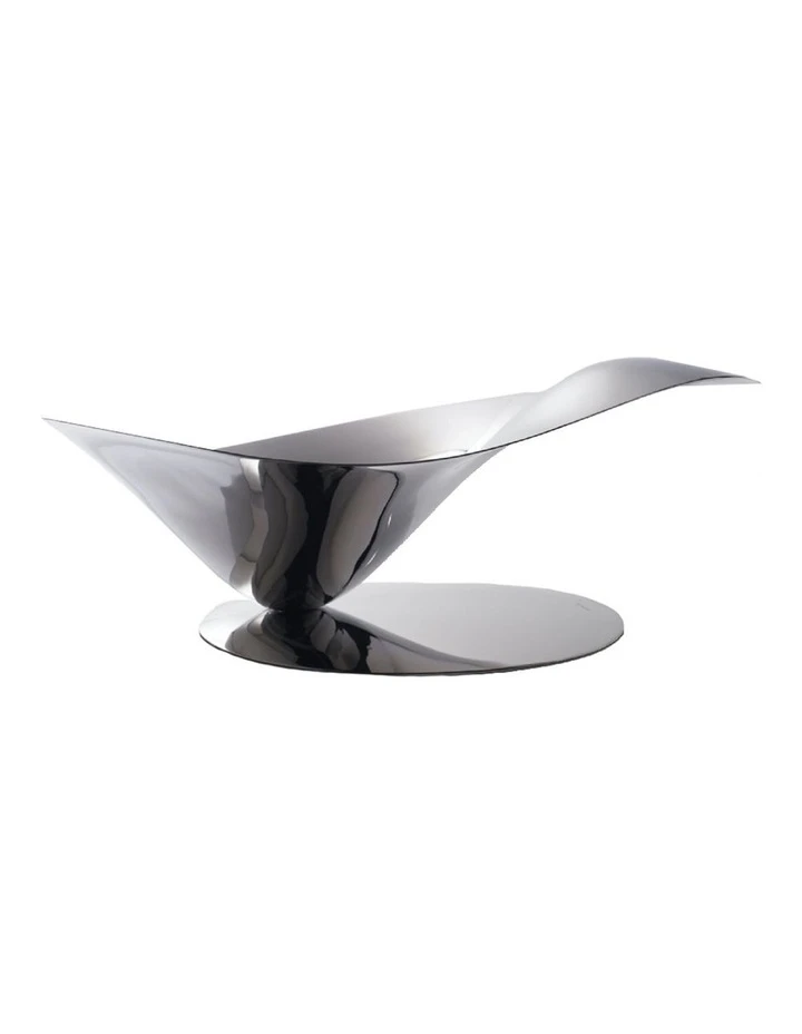 Petalo: The centerpiece that stands on a steel sheet, has a kinetic shape. This fruit bowl resting seamlessly suspended on a steel sheet with a delicate but sensitive shape.