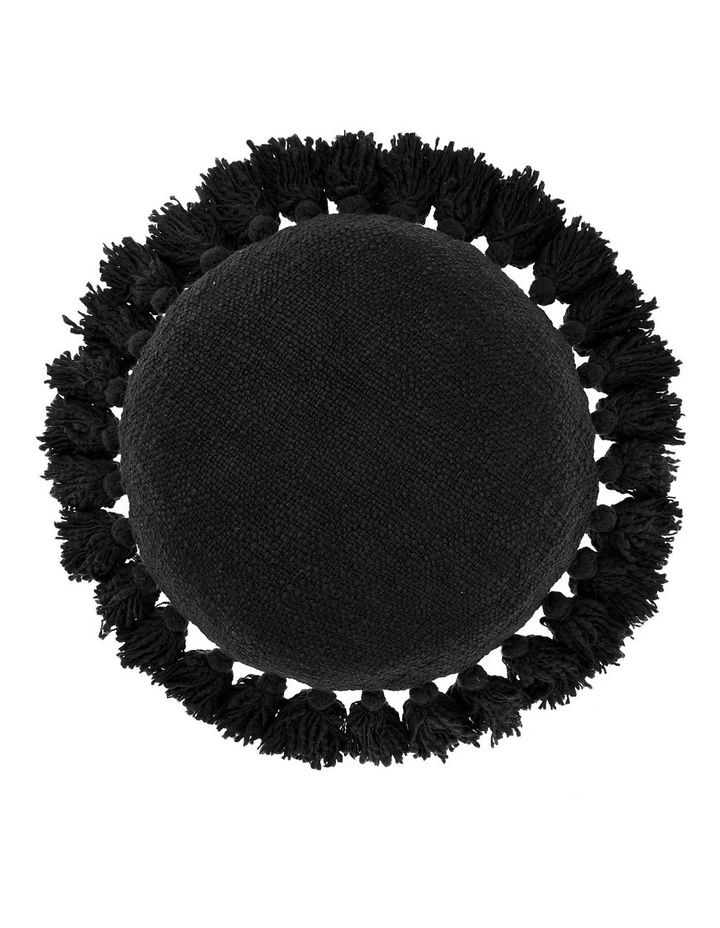 A Linen House show-stopper, our round Florida cushion, which now comes in black, is made from woven cotton and is trimmed with statement tassels.
