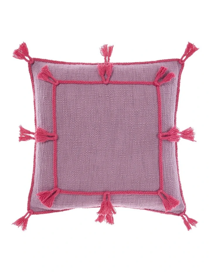 Made from woven cotton, this fabulous cushion returns in a stunning hue of orchid, which showcases its contrast pink trims in a fish-tail plait with tasseled knots throughout.