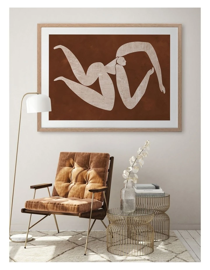 Caroline Cut-Out IV Print Oak Frame – Drawing inspiration from the iconic cut-out style artwork from modern art master Matisse, this artwork features a simplistic, caricature-like portrait of a figure with exaggerated limbs. The colour palette is warm and earthy, featuring a neutral beige coloured figure against a rich brown textured background. This artwork has been created to match with Caroline Cut-Out I, II and III.FRAMED ART: Giclee printed using archival inks and paper – which means no fading! Framed with a quality moulding and mounted behind museum grade plexiglass. Comes ready to hang.
