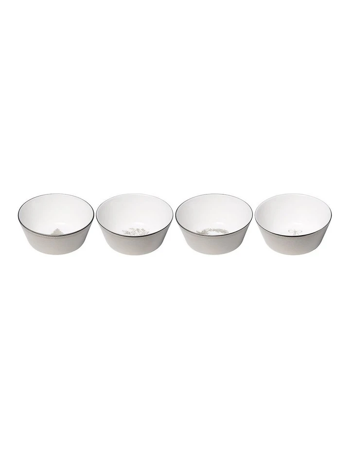 Drinks and delicious nibbles are a customary way to begin the Christmas Day festivities and this set of four 11cm Winter White Nibble Bowls provides a delightful selection of festive themed bowls each carrying a detailed silver illustration of; holly, a wreath, a Christmas tree and mistletoe. The outside of each bowl is embellished with a silver line and scroll pattern for a luxurious, stylish look to enhance the Christmas table. Presented in a signature Wedgwood blue box, this set is crafted in fine bone china for superior strength, silky white colour and translucency making an ideal gift for those who love to entertain at Christmas.