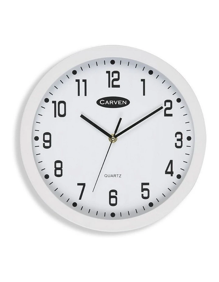 High quality analogue clock that can be wall mounted. Product Features: Large, clear numbers and quality hands. 300mm diameter. White, round face and rim.