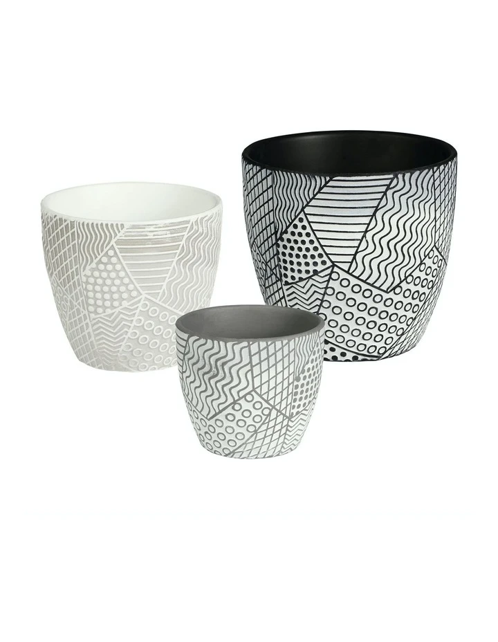 - Set includes three cylindrical pots in varying sizes perfect for placing your favourite.