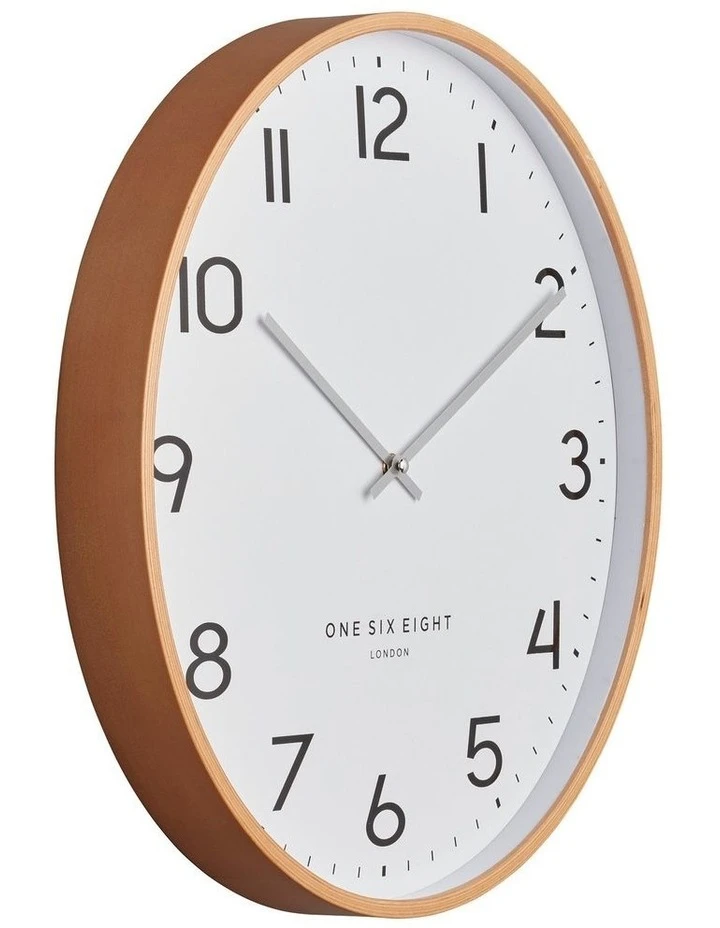 The SILENT Olivia Wall Clock by One Six Eight London features bold Arabic numerals, striking brushed chrome hands. The Olivia also has a lovely plywood case and a glass lens. The safe option that is sure to suit all homes and offices. Available a diameter of 41cm and 53cm iwith a depth off 4.5cm.. Using the highest quality silent clock movement, the Olivia wall clock has been designed in the UK and comes complete with a stunning gift box. The Olivia also comes with an amazing 5 year manufactures warranty A conservative white dial with black Arabic numerals combines with the plain wooden casing and brushed brass hands of the Olviia Wall Clock in a fusion of traditional style and modern materials.