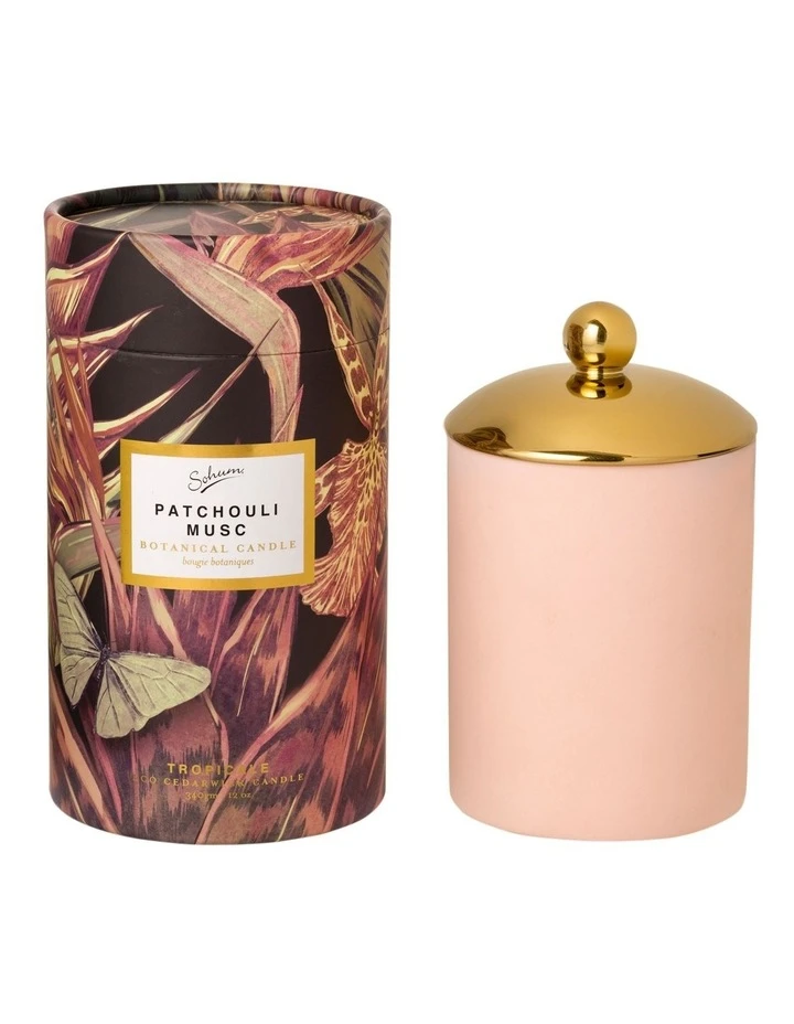 Sohum tropicale Candle in Patchouli Musc, with notes of rosewood, white patchouli, muscwood & vetiver mingled with vegetable wax.
