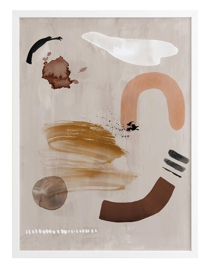 Dig Site II Framed Art Print – An earthy and grounded abstract artwork that features playful shapes, strokes and textures in shades of white, brown, peach and terracotta against a background wash of beige. Pairs with Dig Site I.FRAMED ART: Giclee printed using archival inks and paper – which means no fading! Framed with a quality moulding and mounted behind museum grade plexiglass. Comes ready to hang.