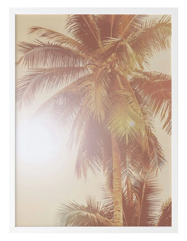 Sunkissed Palm Print White Frame – A golden-toned photographic print featuring a large palm tree being illuminated by the blinding light of the sun.FRAMED ART: Giclee printed using archival inks and paper – which means no fading! Framed with a quality moulding and mounted behind museum grade plexiglass. Comes ready to hang.