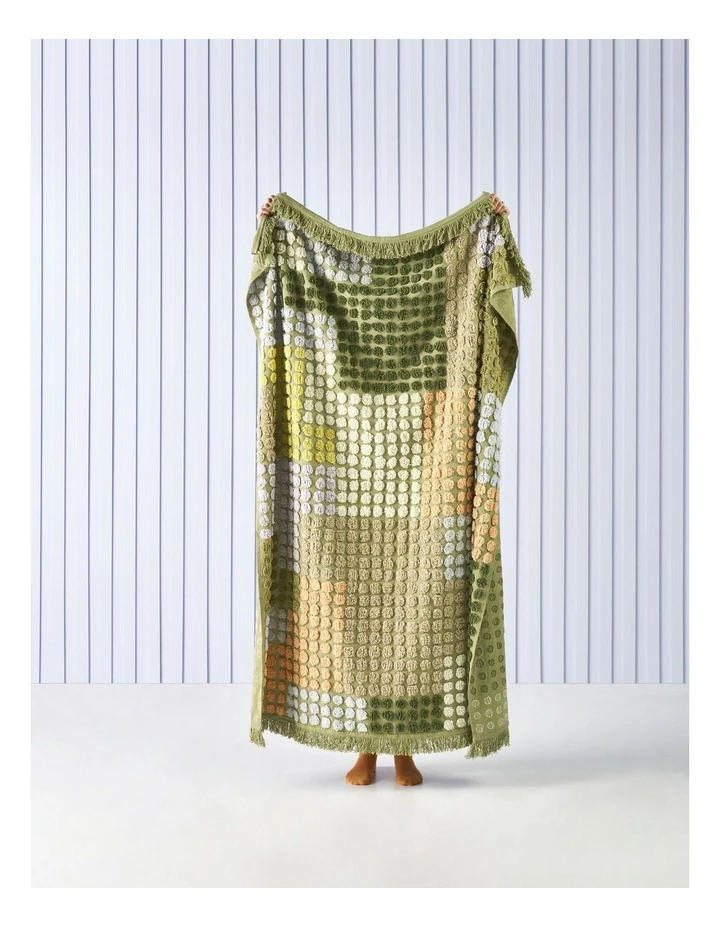 A total ""it"" accessory, fluffy, multi-coloured spots adorn this marvellously lively throw, which features dominant fern hues on a light cotton ground.