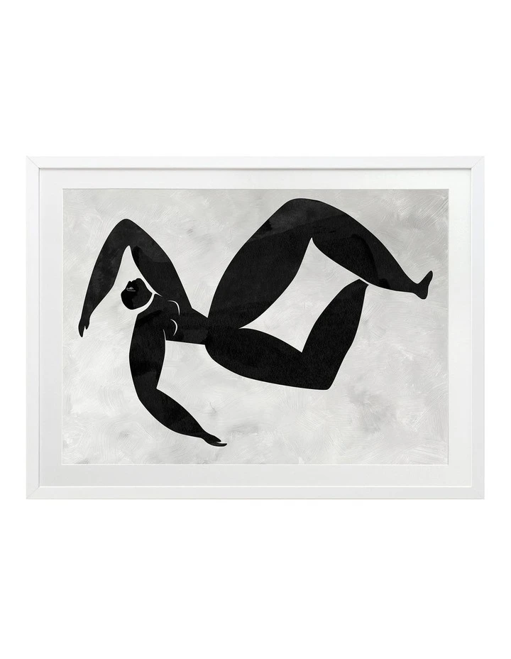 Lydia Cut-Out III Print White Frame – Drawing inspiration from the iconic cut-out style artwork from modern art master Matisse, this artwork features a simplistic, caricature-like portrait of a figure with exaggerated limbs. The colour palette is bold and monochromatic, featuring a black coloured figure against a light grey textured background. This artwork has been created to match with Lydia Cut-Out I, II and IV.FRAMED ART: Giclee printed using archival inks and paper – which means no fading! Framed with a quality moulding and mounted behind museum grade plexiglass. Comes ready to hang.