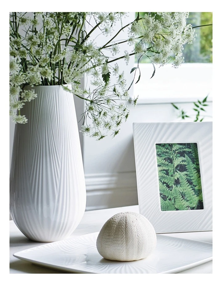 The White Folia Square Tray 30cm will make stylish entertaining an easy fete, thanks to its modern design and beautiful detail. Silky white china is detailed with linear, leaf formations reaching outwards to the edge. The White Folia collection is inspired by the beautiful, natural forms found in nature, perfectly encased in white bone china. This range features individual patterns and motifs unique to each piece, meaning that you can curate your own, bespoke collection. Organic forms and a subtle floral patterns harmonise perfectly with the flowers that they are designed to display, making these items perfect gifts to give with beautiful florals for special occasions or for your own home. Effortlessly bringing the beauty of the outside into your home and presented in a signature Wedgwood gift box.