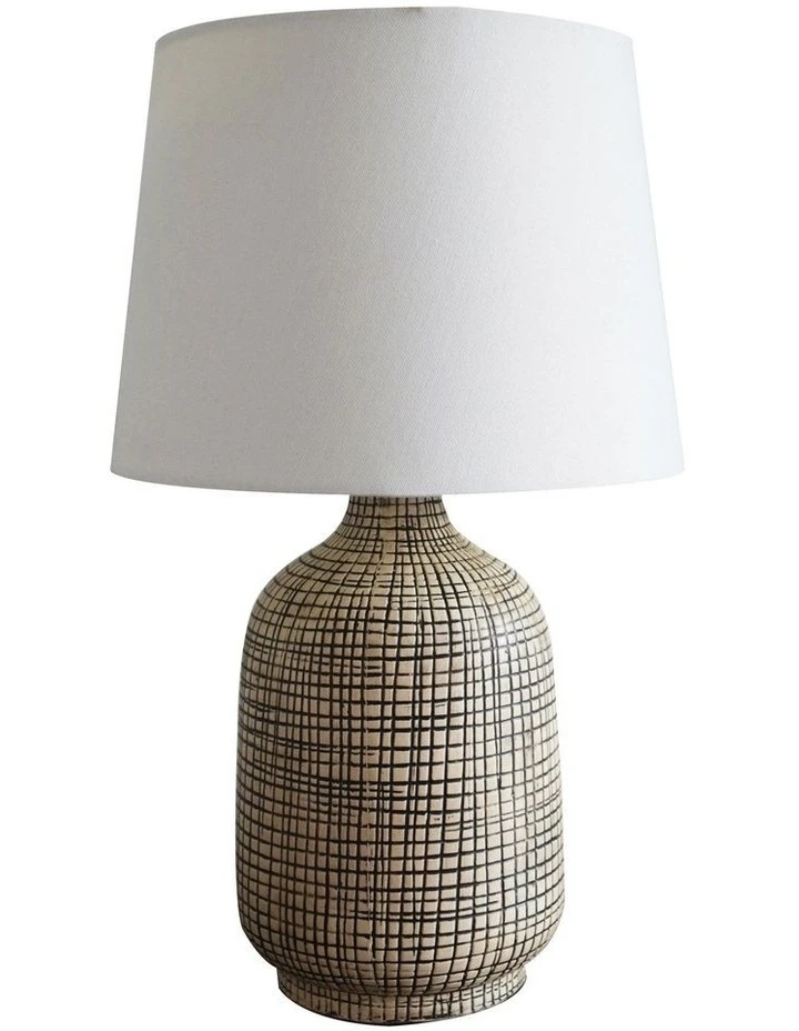 Beautifully crafted, and tribal-inspired. The BISCAY ceramic table lamp has a tapered, ivory linen, fabric shade and an earthy fawn coloured base etched with horizontal and vertical brown-black lines.