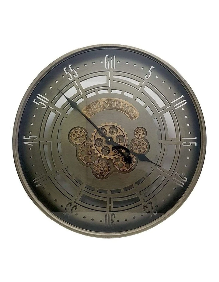Inspired by the industrial era of design this beautifully crafted wall clock puts the popular in mechanics. The unpolished look provides a neutral aesthetic, while the visible inner mechanisms and cut out details provide visual interest. The frame is made of pure metal with an antique rustic washed metal finish and the clock face is hand-carved from solid wood.