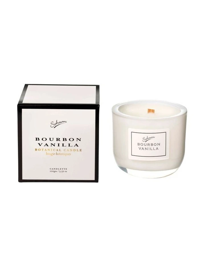 SOHUM Candlette made with botanical waxes induces a soft ambient glow infused with vivid fragrance for optimum burning. Bourbon Vanilla Notes Caramel, Almond Milk, Tobacco Flower, Bergamot, Red Orange, Driftwood.