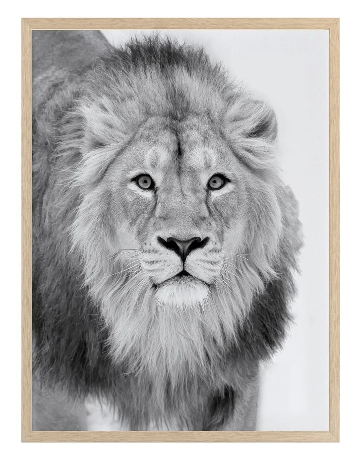 Lion Hunt – An intense photographic portrait of a Lion in black and white.FRAMED ART: Giclee printed using archival inks and paper – which means no fading! Framed with a quality moulding and mounted behind museum grade plexiglass. Comes ready to hang.