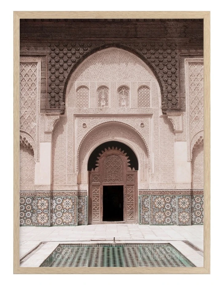 Moroccan Pool Print Oak Frame – Ignite your passion for iconic Moroccan architecture with this beautifully symmetrical photograph that highlight the grand, ornately crafted archways, intricate tiling and crystal clear pool of a traditional Moroccan courtyard.FRAMED ART: Giclee printed using archival inks and paper – which means no fading! Framed with a quality moulding and mounted behind museum grade plexiglass. Comes ready to hang.