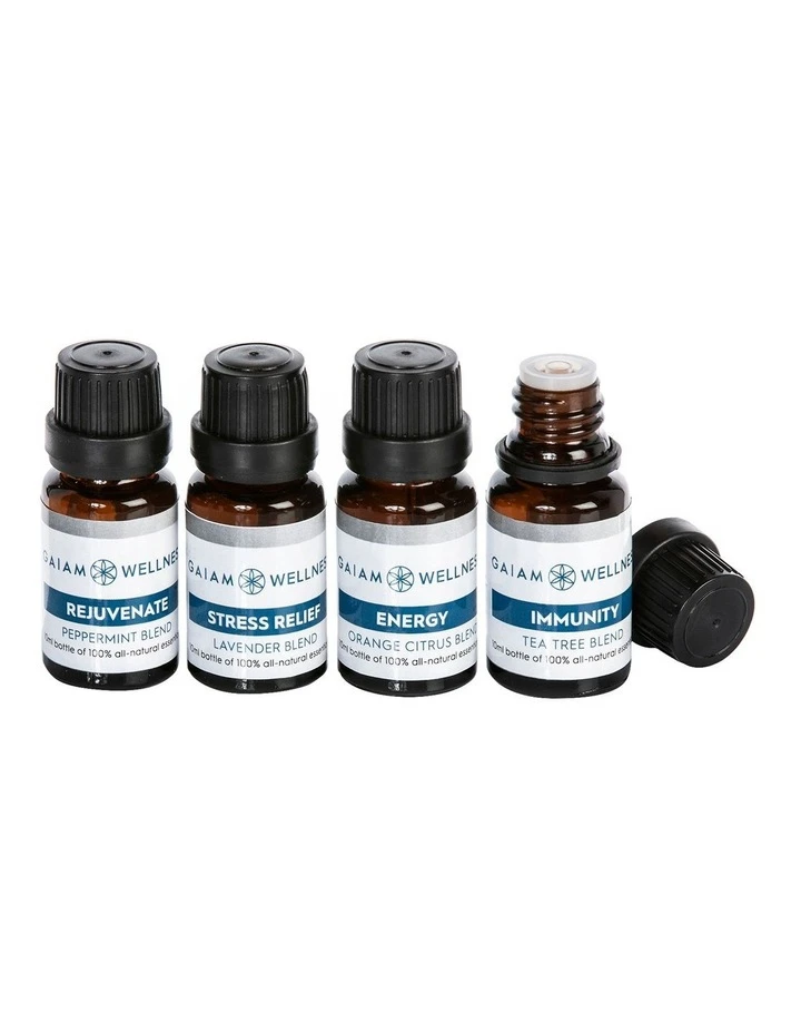 100% all natural oils Four pack of 10ml bottles Peppermint for Rejuvenation, Lavender for Stress Relief, Orange for Energy and Tea Tree for Immune Health.