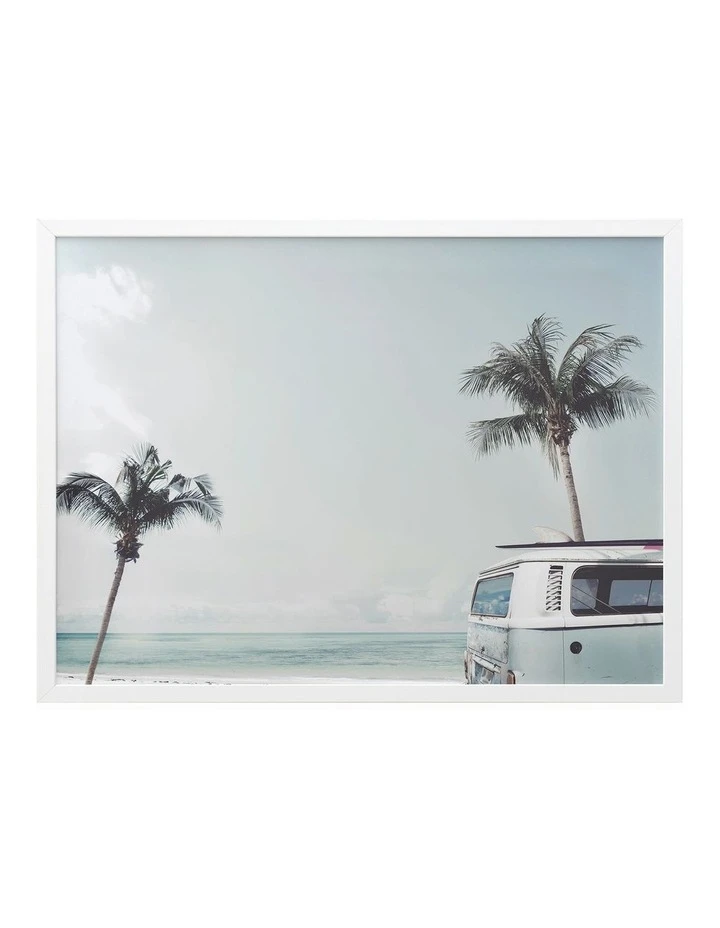 Good Vibrations – A laid-back photographic image featuring a light blue kombi van at the beach. FRAMED ART: Giclee printed using archival inks and paper – which means no fading! Framed with a quality moulding and mounted behind museum grade plexiglass. Comes ready to hang.