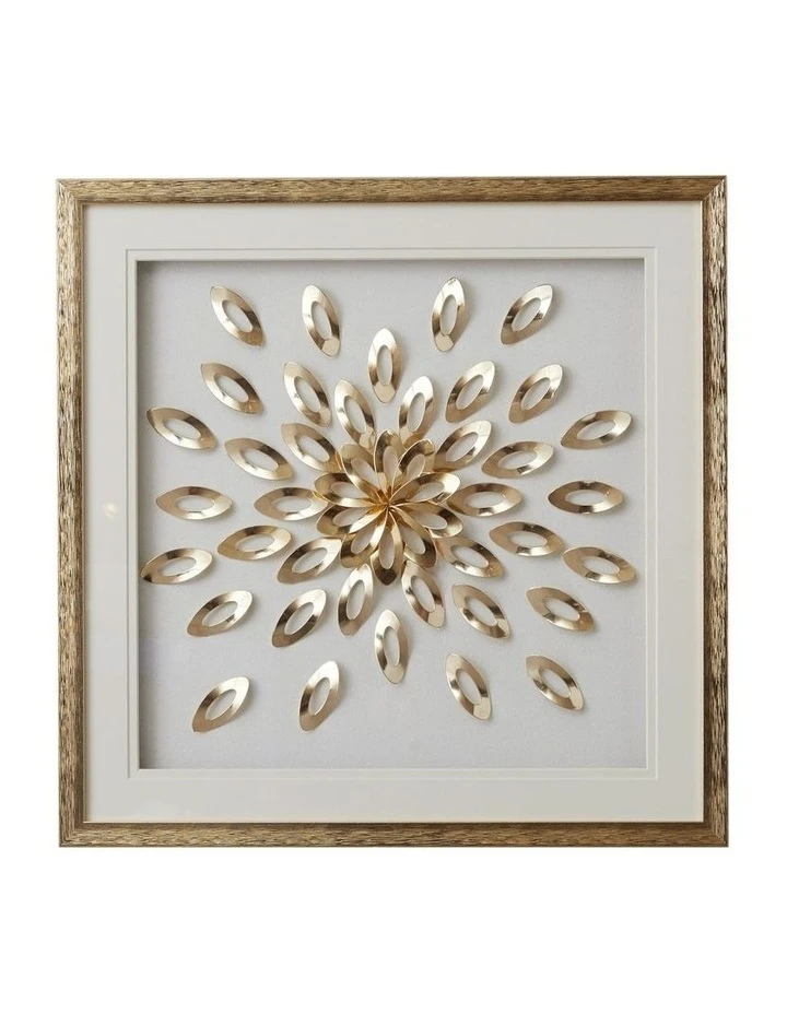 A stunning shadow box featuring a gold print in the shape of a flower.