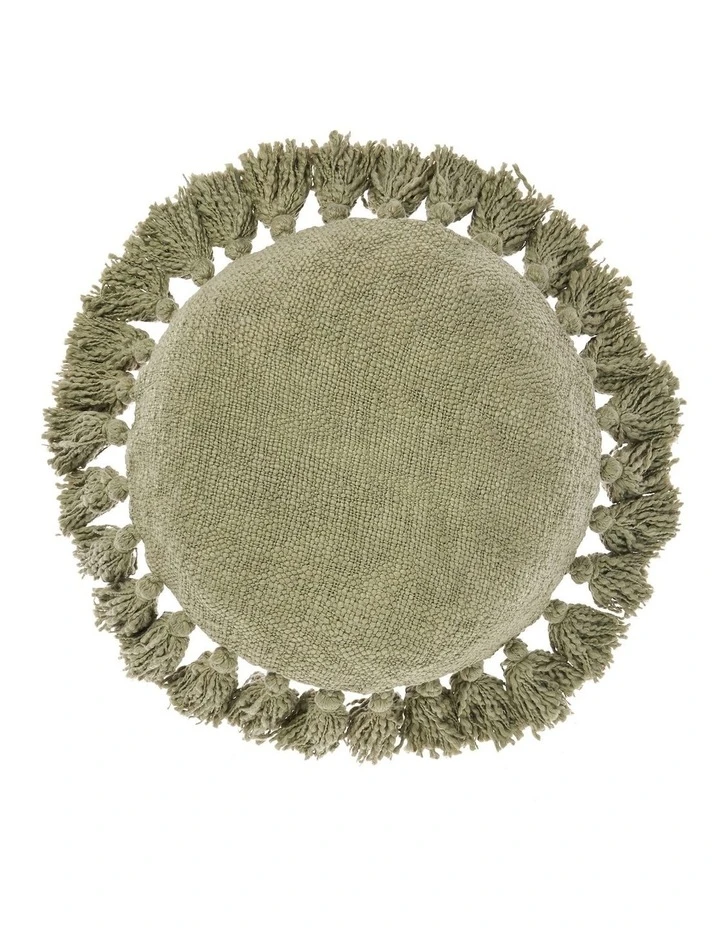 A Linen House show-stopper, our round Florida cushion, which now comes in eucalyptus, is made from woven cotton and is trimmed with statement tassels.
