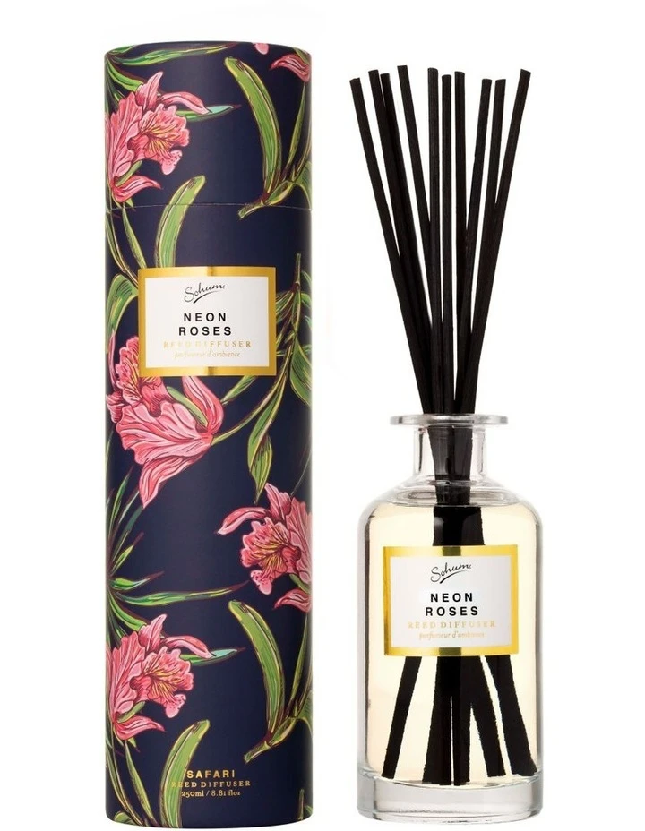 SOHUM Fragrance diffuser permeates your space with continuous full fragrance. Natural reeds are infused with fine fragrance to deliver a perfumed whisper throughout your environment. Neon Roses Notes: White Flowers, Blue Tansy, Tea Roses, Violet Leaf.