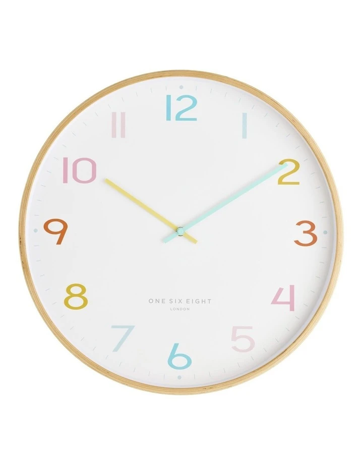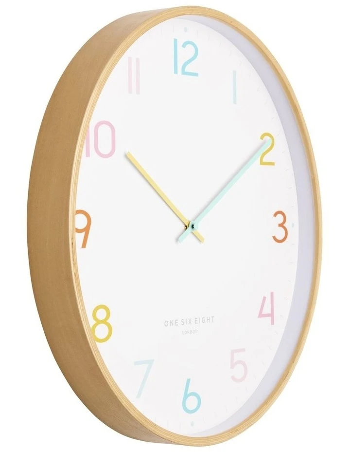 Slip into a daydream with our beautiful plywood case wall clock. In a fresh and pretty daytime palette, pure white face and rainbow drop coloured numerals this happy colourful clock will help you feel the joys of spring any month of the year.