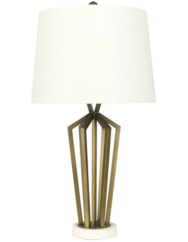 Stylish geometric metal lamp base, matched with an ivory linen fabric shade. ROMSEY is a bronze-painted metal base placed on a white marble pedestal. A tall lamp, perfect for lounge or bedside tables.