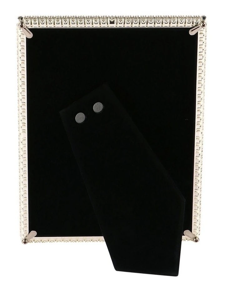 Zinc Alloy photo frame with glass. Frame size: 13x18cm. Velvet easel backing allowing it to sit horizontally and vertically