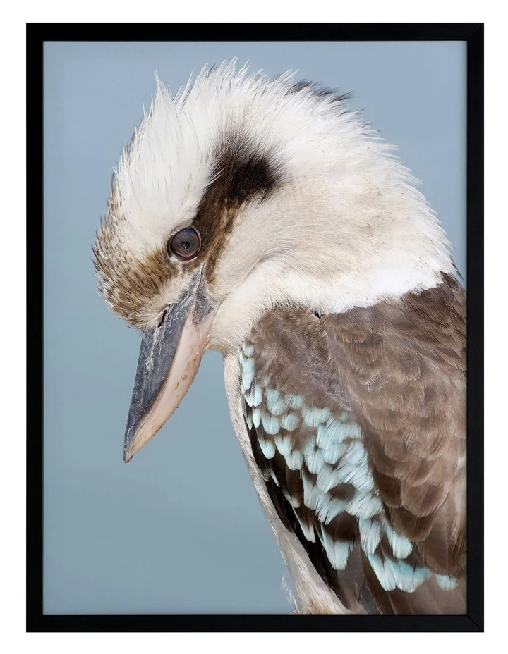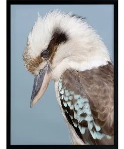Kookaburra – You can almost hear the laughing Kookaburra finding its territory in your space, sharing it’s energy with you. The blue-grey background of this photographic print of the Kookaburra brings out the light green feathers of it’s wing.FRAMED ART: Giclee printed using archival inks and paper – which means no fading! Framed with a quality moulding and mounted behind museum grade plexiglass. Comes ready to hang.