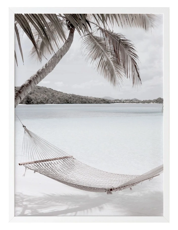 Rest Easy Print White Frame – Kick back and relax in a tropical oasis with this photographic print, featuring a hammock hung between two palm trees, overlooking a beautiful bay.FRAMED ART: Giclee printed using archival inks and paper – which means no fading! Framed with a quality moulding and mounted behind museum grade plexiglass. Comes ready to hang.