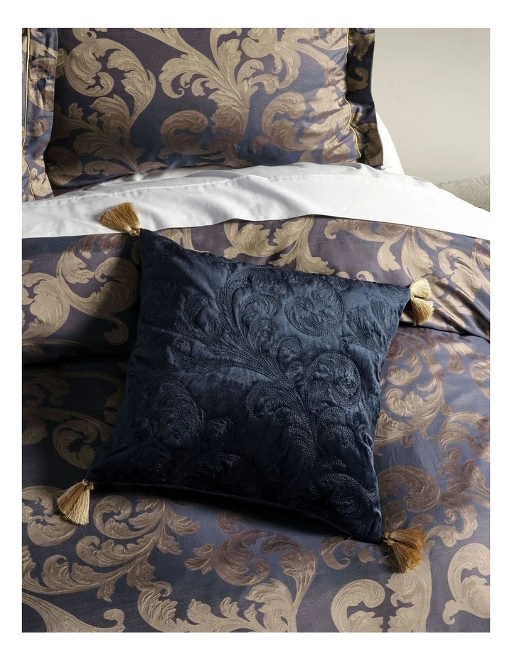 Inspired by traditional baroque textiles, this quilted cushion embodies a level of luxury that every bedroom deserves. Ornate with an embroidered design, this sensational velvet cushion in navy is adorned with gold corner tassels and looks best paired with its coordinating quilt cover set and European pillowcases.