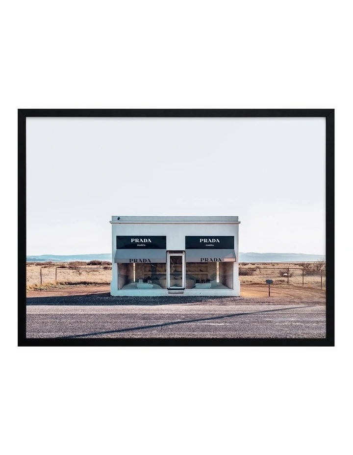 Prada – A photograph of the iconic Prada Marfa installation in Texas. Photographed by Robin Benzrihem.FRAMED ART: Giclee printed using archival inks and paper – which means no fading! Framed with a quality moulding and mounted behind museum grade plexiglass. Comes ready to hang.