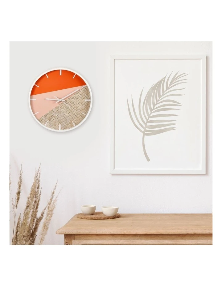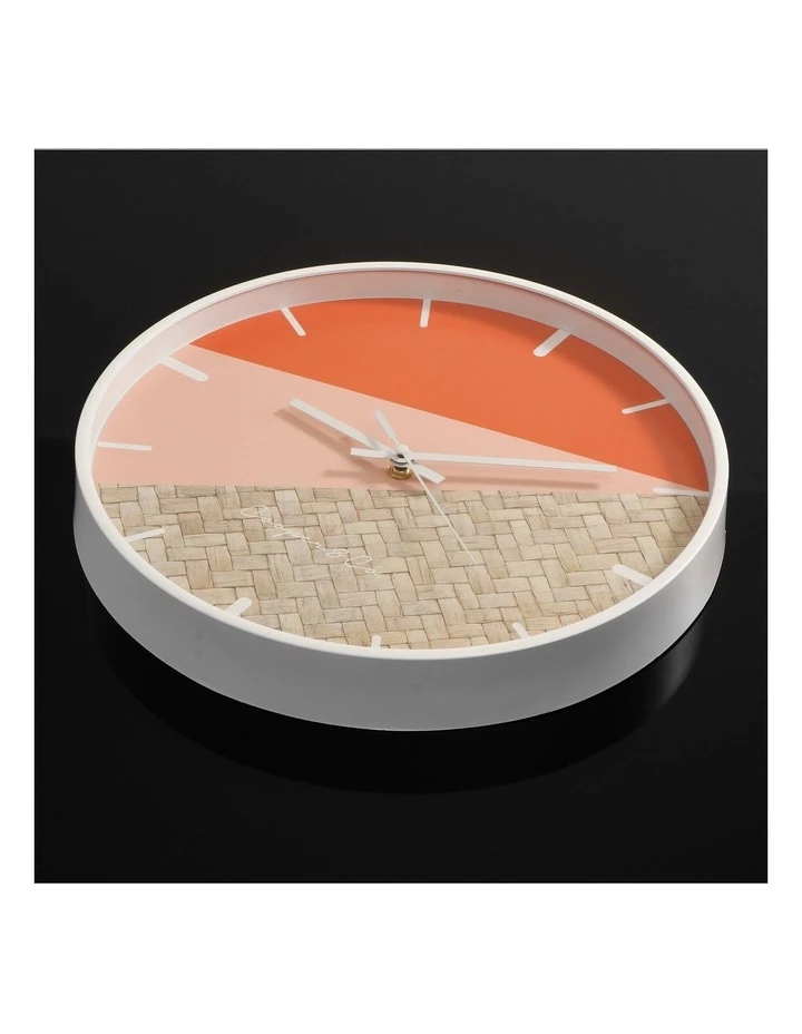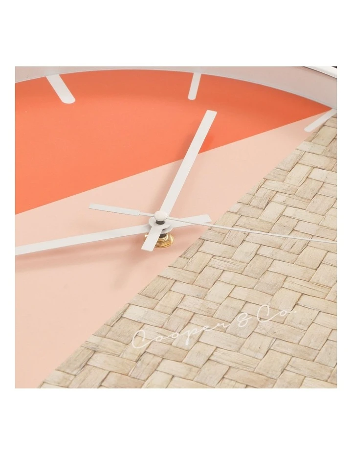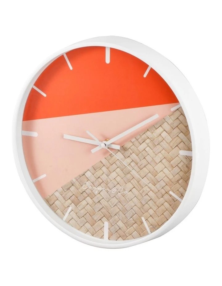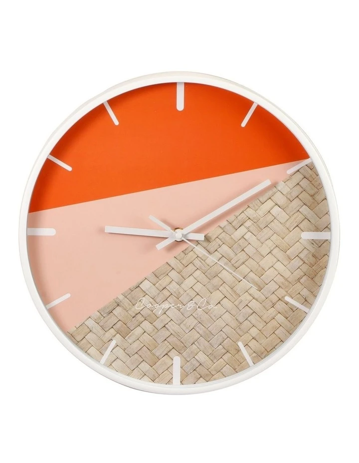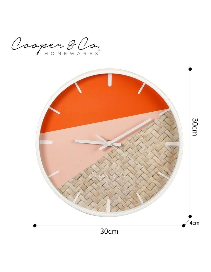 Elevate your home office, bedroom, living room, or other space with the style and practicality of the Cooper & Co. 30 cm Watermelon/Rattan Cayman Silent Movement Round Wall Clock