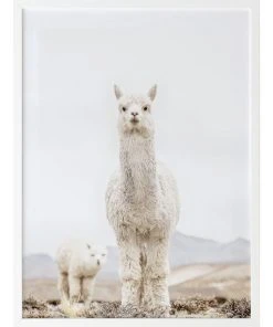 No Drama Llama – A photographic portrait of a white Llama and its baby in the wild.FRAMED ART: Giclee printed using archival inks and paper – which means no fading! Framed with a quality moulding and mounted behind museum grade plexiglass. Comes ready to hang.