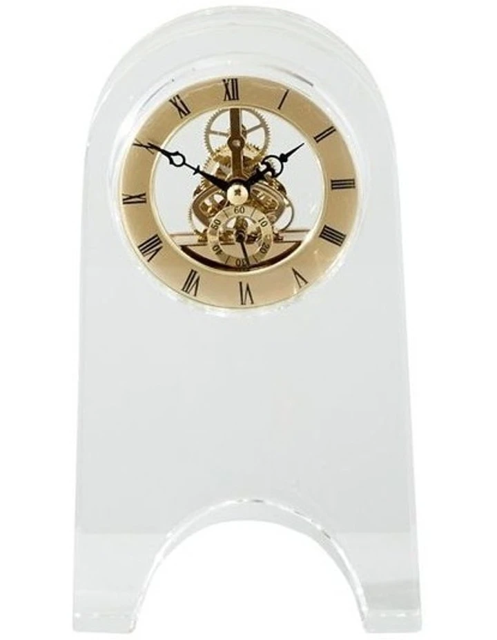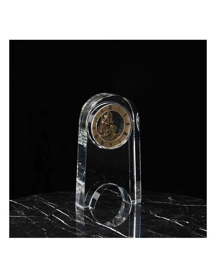 A gorgeous crystal clock with a golden clock face and roman numeral display.