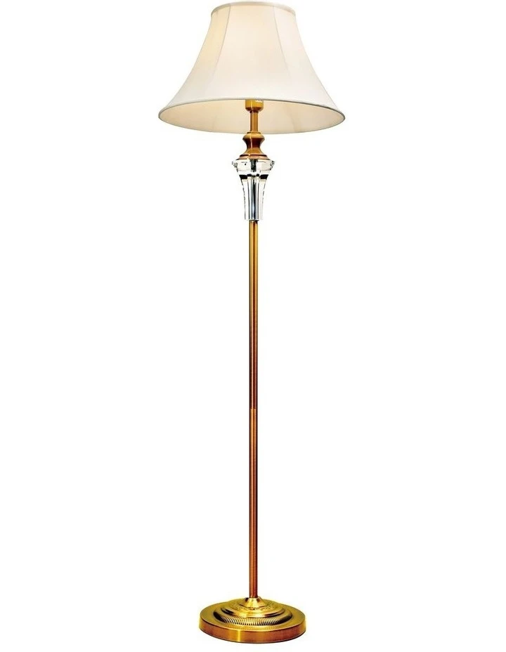 - Faceted clear crystal, Brass finish accents and Round footed stand