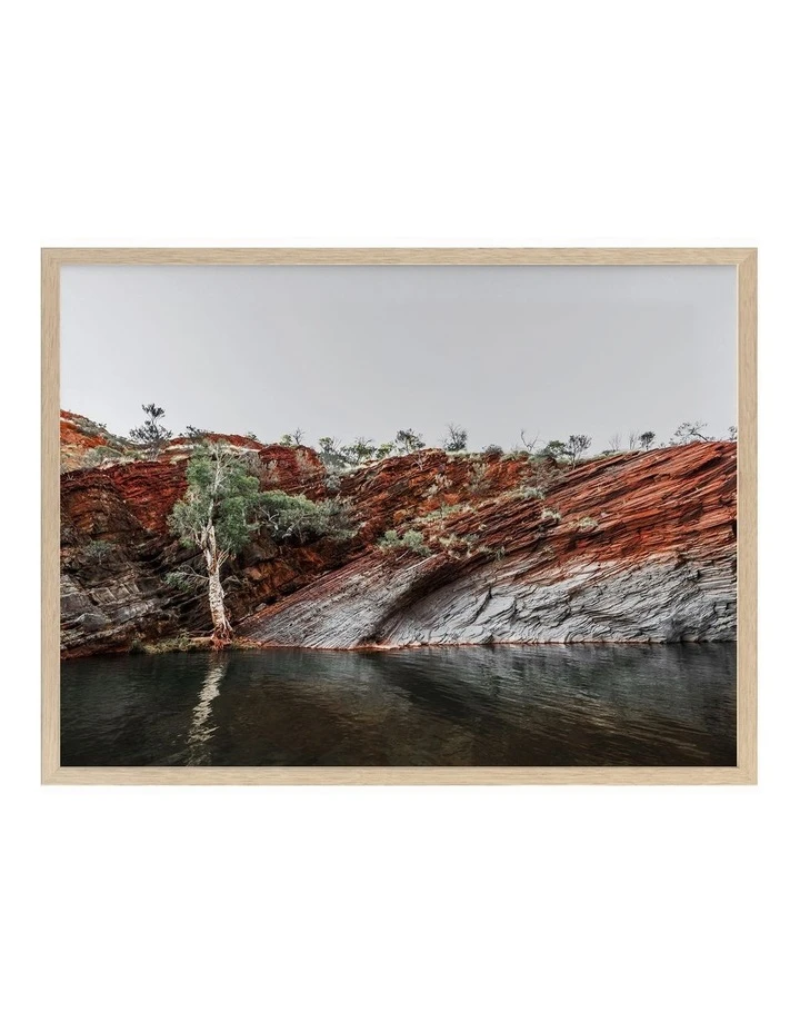 By the Billabong – A beautiful photographic image of a water hole surrounded by a red-earth rockface.FRAMED ART: Giclee printed using archival inks and paper – which means no fading! Framed with a quality moulding and mounted behind museum grade plexiglass. Comes ready to hang.