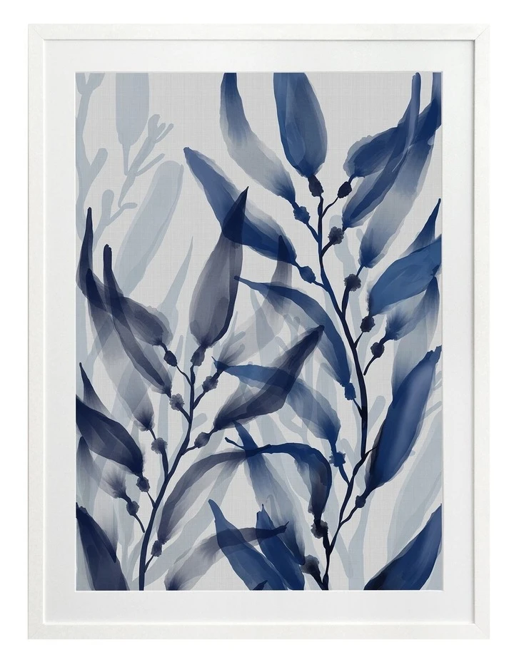 Shelter Island II Print White Frame – This Hamptons style artwork features soft, delicate indigo blue watercolour sea grass moving across a soft grey background. Pairs with Shelter Island I.FRAMED ART: Giclee printed using archival inks and paper – which means no fading! Framed with a quality moulding and mounted behind museum grade plexiglass. Comes ready to hang.