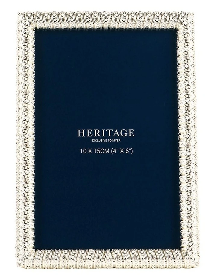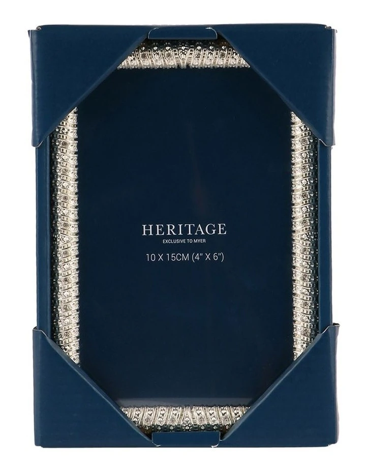 Zinc Alloy photo frame with glass. Frame size: 10x15cm. Velvet easel backing allowing it to sit horizontally and vertically