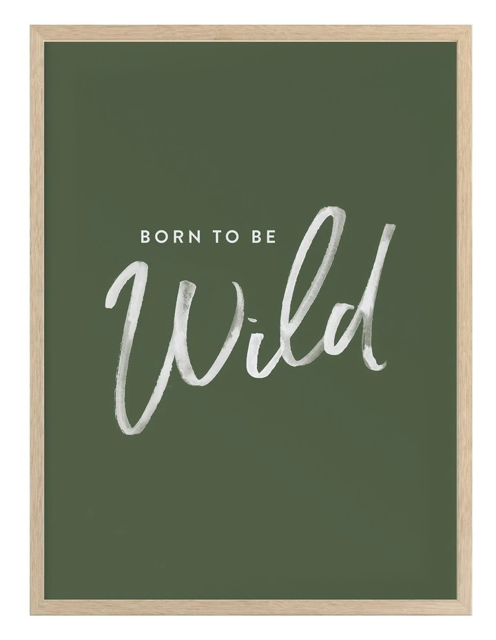 Born to be Wild – A typographic artwork featuring the words ‘Born to be wild’ against a khaki green background.FRAMED ART: Giclee printed using archival inks and paper – which means no fading! Framed with a quality moulding and mounted behind museum grade plexiglass. Comes ready to hang.