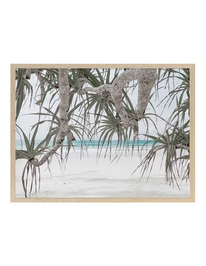 Pandanus II – A blown-out photographic image featuring pandanus trees in front of the ocean.FRAMED ART: Giclee printed using archival inks and paper – which means no fading! Framed with a quality moulding and mounted behind museum grade plexiglass. Comes ready to hang.