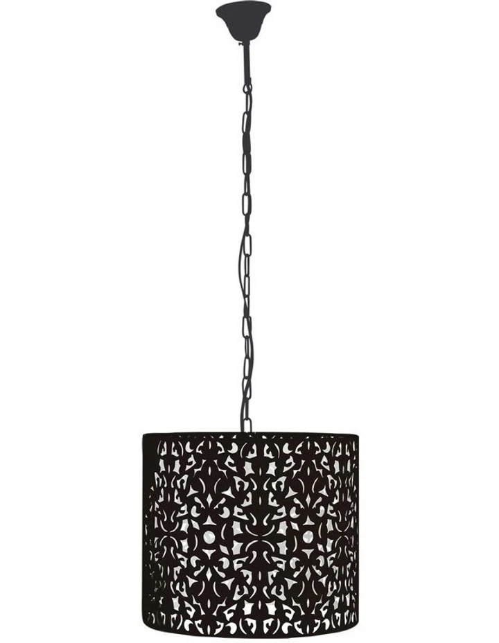 Our popular Vicky range is stunning when lit, as the cut-out design in the shade is reflected onto the ceiling or wall. This Vicky pendant features a matt black powdercoated metal shade, suspended on a chain and stylish canopy. Vicky is also available in a matt white finish, in other sizes and wall lights.