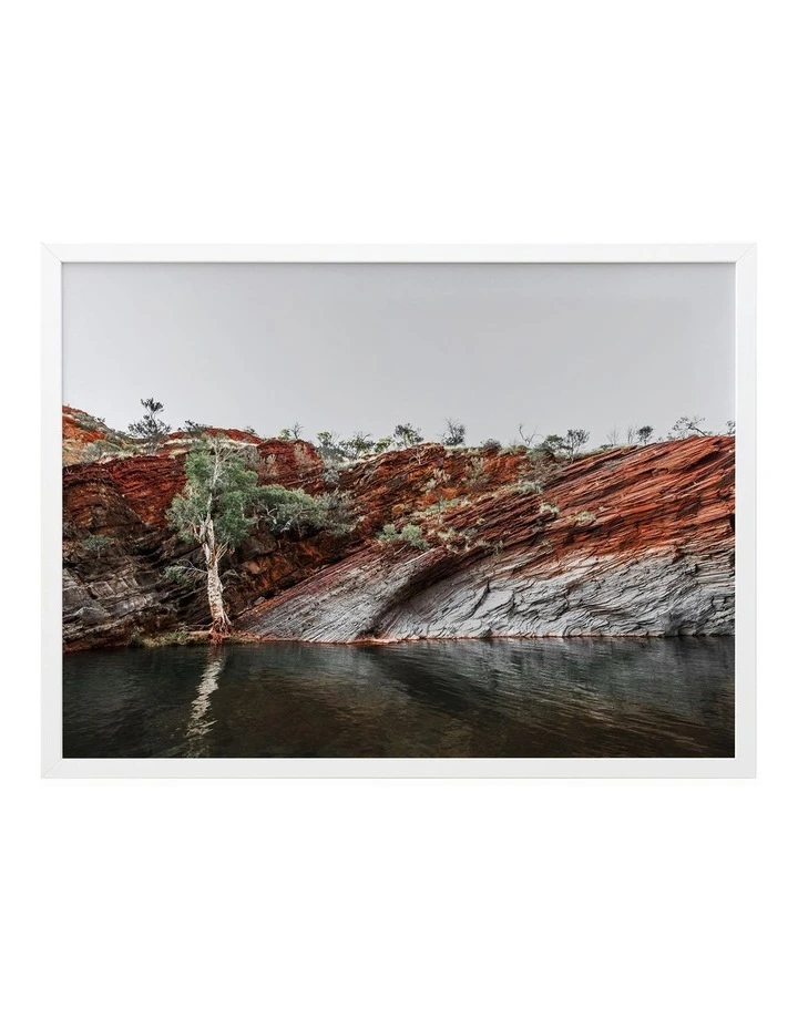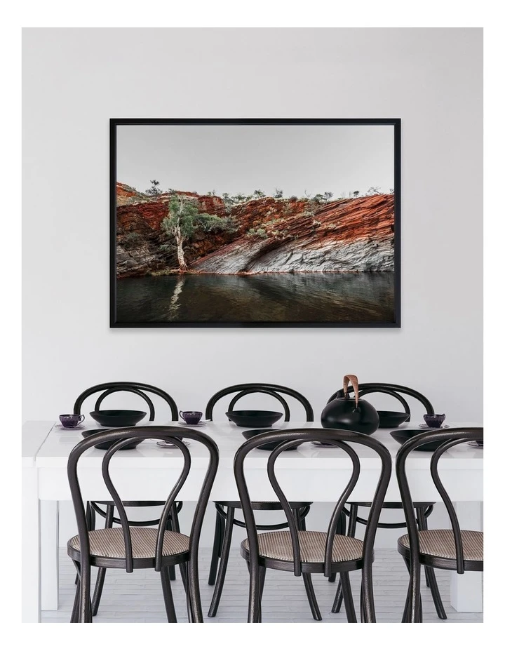 By the Billabong – A beautiful photographic image of a water hole surrounded by a red-earth rockface.FRAMED ART: Giclee printed using archival inks and paper – which means no fading! Framed with a quality moulding and mounted behind museum grade plexiglass. Comes ready to hang.