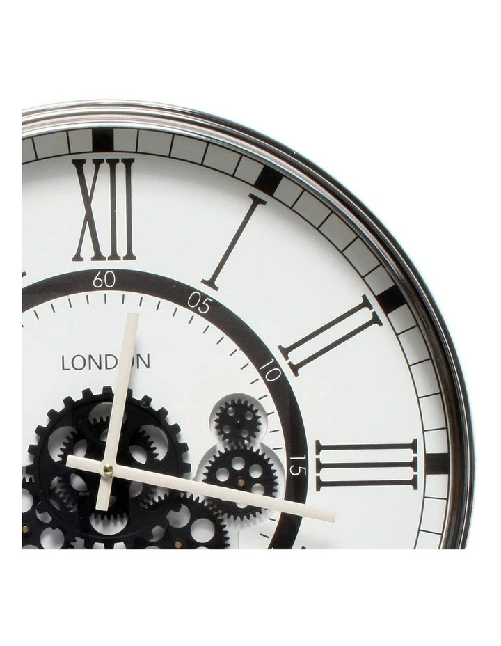 Clean, sophisticated and modern, this beautifully crafted wall clock puts the popular in mechanics. The visible inner mechanisms and cut out details provide visual interest. The frame is made of pure metal with a clean, modern finish.