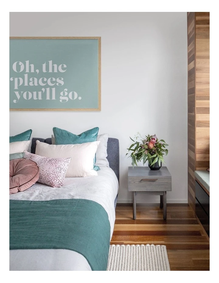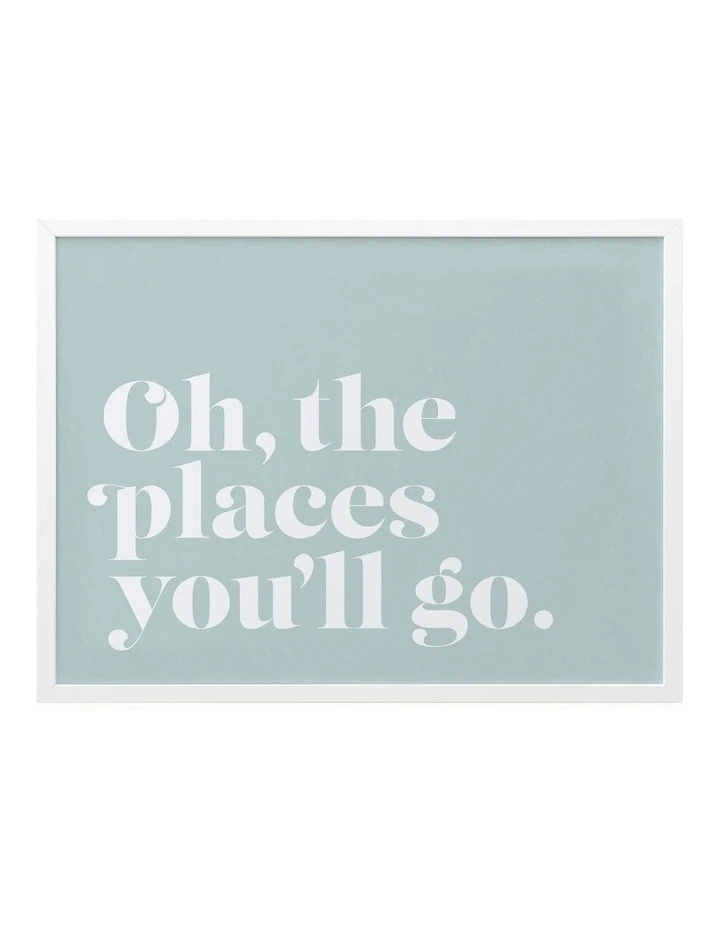 Oh the Places – A typographic piece featuring a bold, white font reading ‘Oh the places you’ll go’ against a tiffany blue background.FRAMED ART: Giclee printed using archival inks and paper – which means no fading! Framed with a quality moulding and mounted behind museum grade plexiglass. Comes ready to hang.