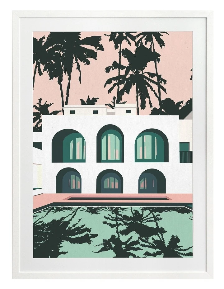 Real Housewives Print White Frame – A playful, pastel pink and green illustration featuring a white mansion with a pool, against a background of silhouetted palm trees. FRAMED ART: Giclee printed using archival inks and paper – which means no fading! Framed with a quality moulding and mounted behind museum grade plexiglass. Comes ready to hang.