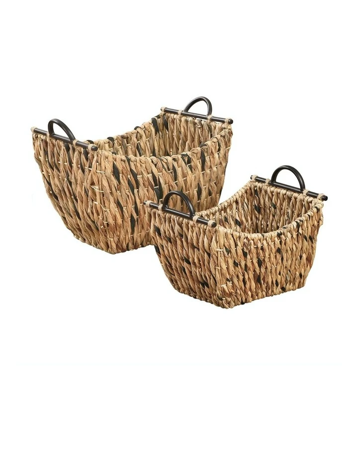 - Hand-woven from Water Hyacinth reeds, this duo of flat-bottomed baskets will stand upright and open.