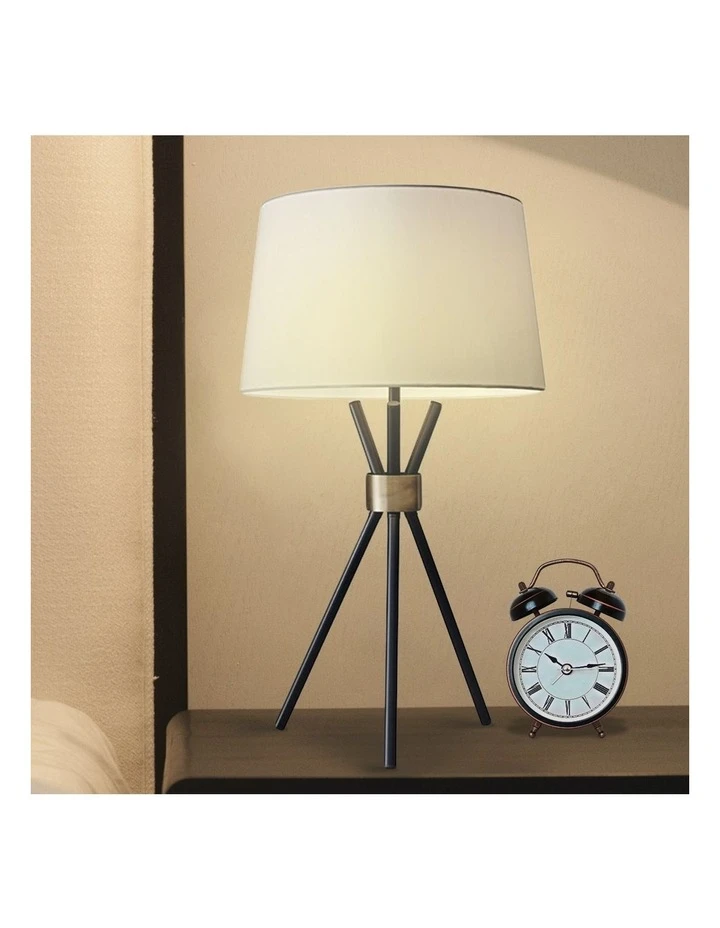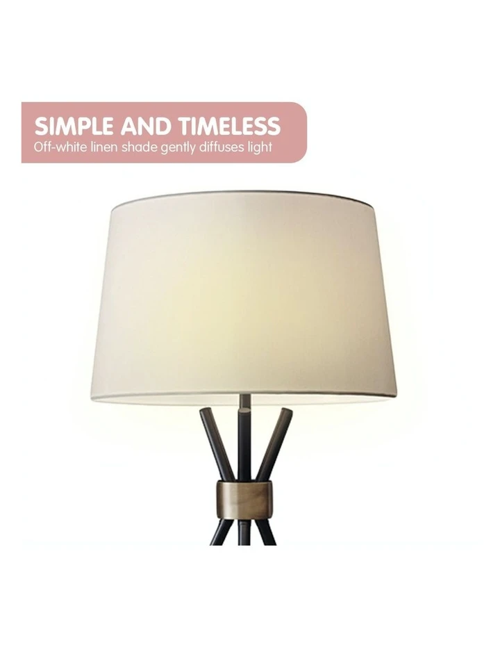 A stunning silhouette with mid-century elements, this table lamp is a tripod of black metal legs gathered at the neck with an antique brass accent. It features a tapered drum shade in contrasting off-white linen.
