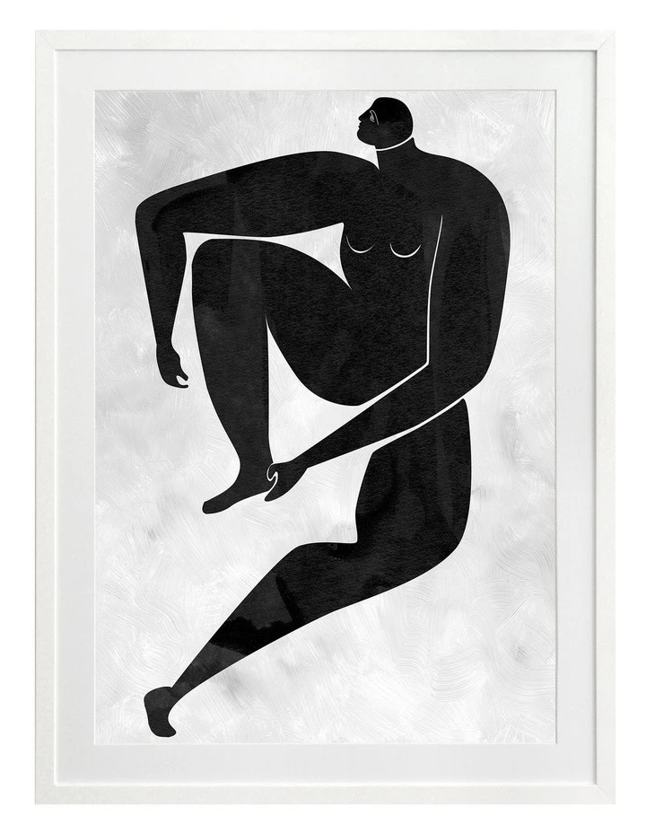 Lydia Cut-Out I Print White Frame – Drawing inspiration from the iconic cut-out style artwork from modern art master Matisse, this artwork features a simplistic, caricature-like portrait of a figure with exaggerated limbs. The colour palette is bold and monochromatic, featuring a black coloured figure against a light grey textured background. This artwork has been created to match with Lydia Cut-Out II, III and IV.FRAMED ART: Giclee printed using archival inks and paper – which means no fading! Framed with a quality moulding and mounted behind museum grade plexiglass. Comes ready to hang.