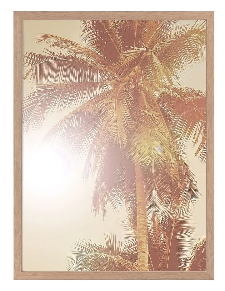Sunkissed Palm Print Oak Frame – A golden-toned photographic print featuring a large palm tree being illuminated by the blinding light of the sun.FRAMED ART: Giclee printed using archival inks and paper – which means no fading! Framed with a quality moulding and mounted behind museum grade plexiglass. Comes ready to hang.