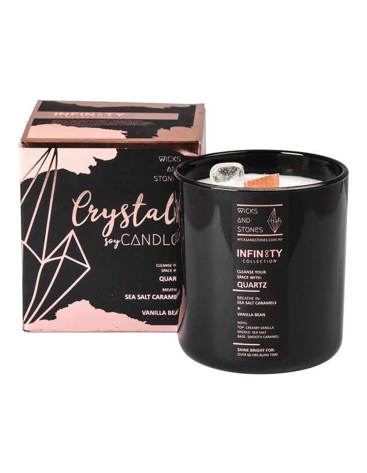 Quartz: A balanced blend of salted caramel and creamy vanilla fills your space with a sense of clarity. It includes one quartz stone to promote healing and positive energy.